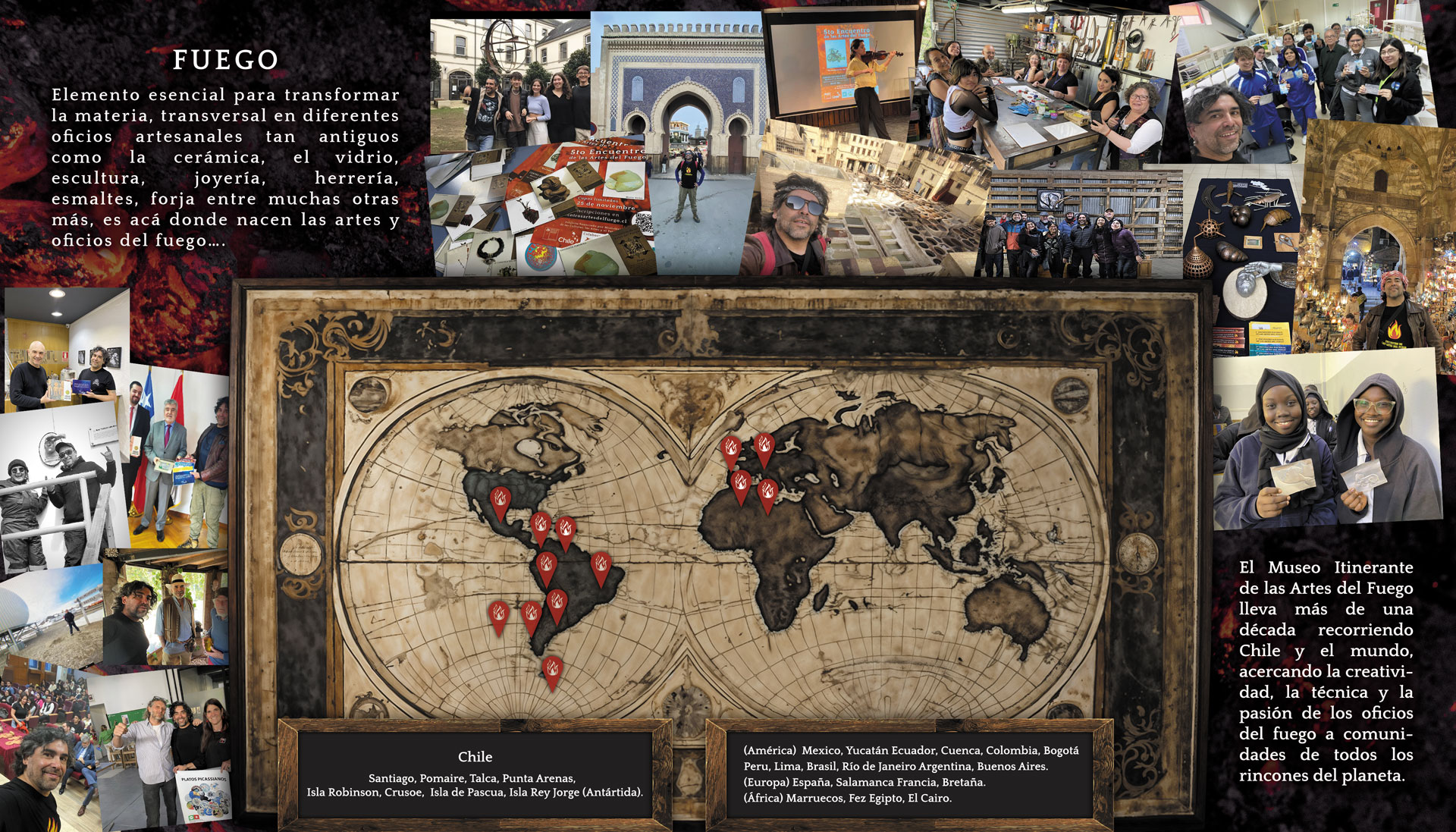 Pedro me comenta, con agradecimiento, que desde el año 2020 ha contado con el apoyo de Fondart para la realización de las exposiciones y encuentros del Museo Itinerante de las Artes del Fuego. También recuerda la participación de personas importantes que lo han acompañado en este camino, como Arturo de la O, Maricarmen Cartes, Juan Carlos Orellana, Catalina González, Gabriela Fontana, Carolina Láinez, Juan Lobos, entre otros, además de varios orfebres de países vecinos.